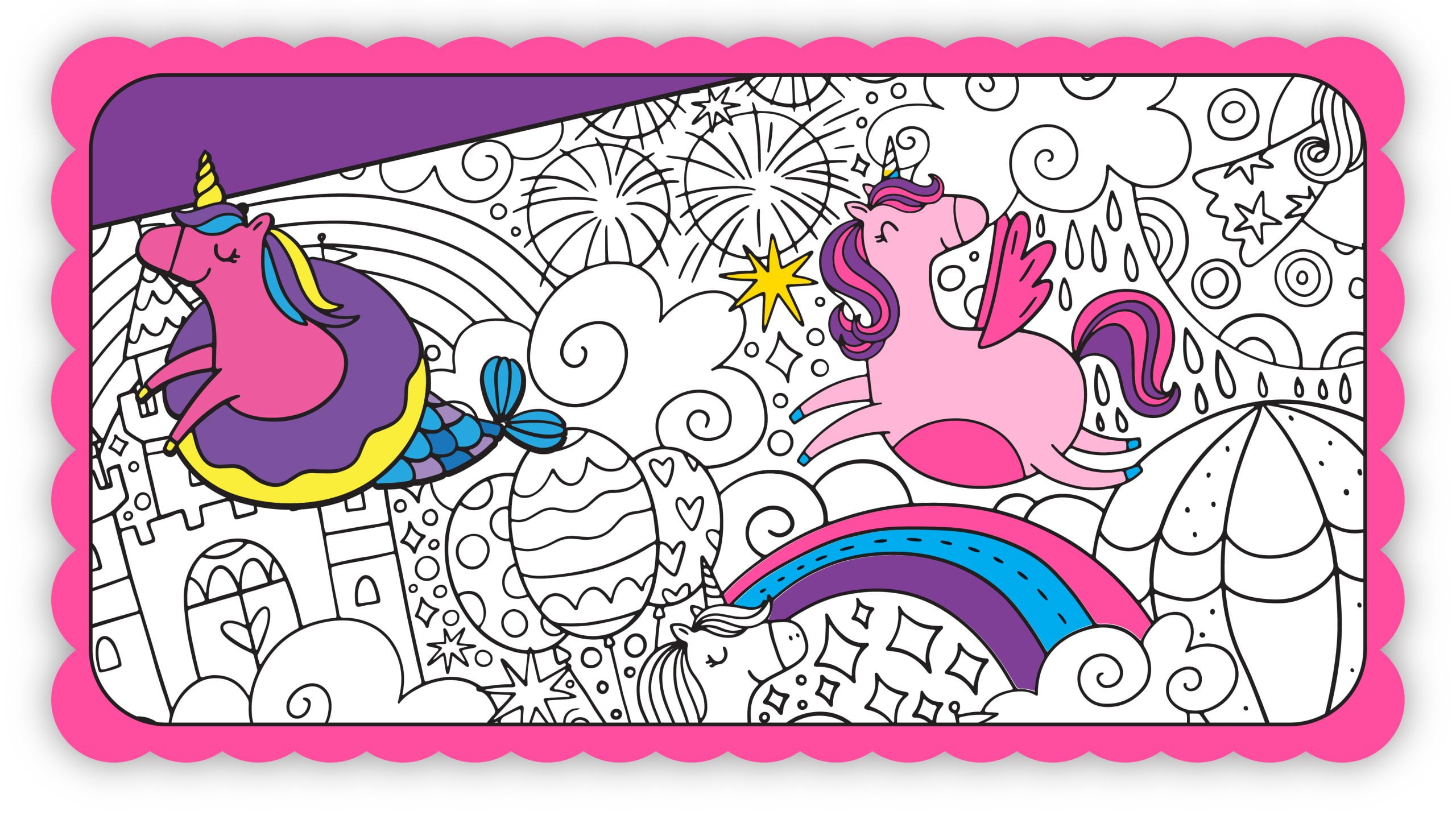 Our magical mat invites you to unleash your creativity and explore a world where unicorns prance beside magical castles, cakes soar high, merry-go rounds spin with joy, mermaids swim gracefully, and rainbows shimmer in the sky.
