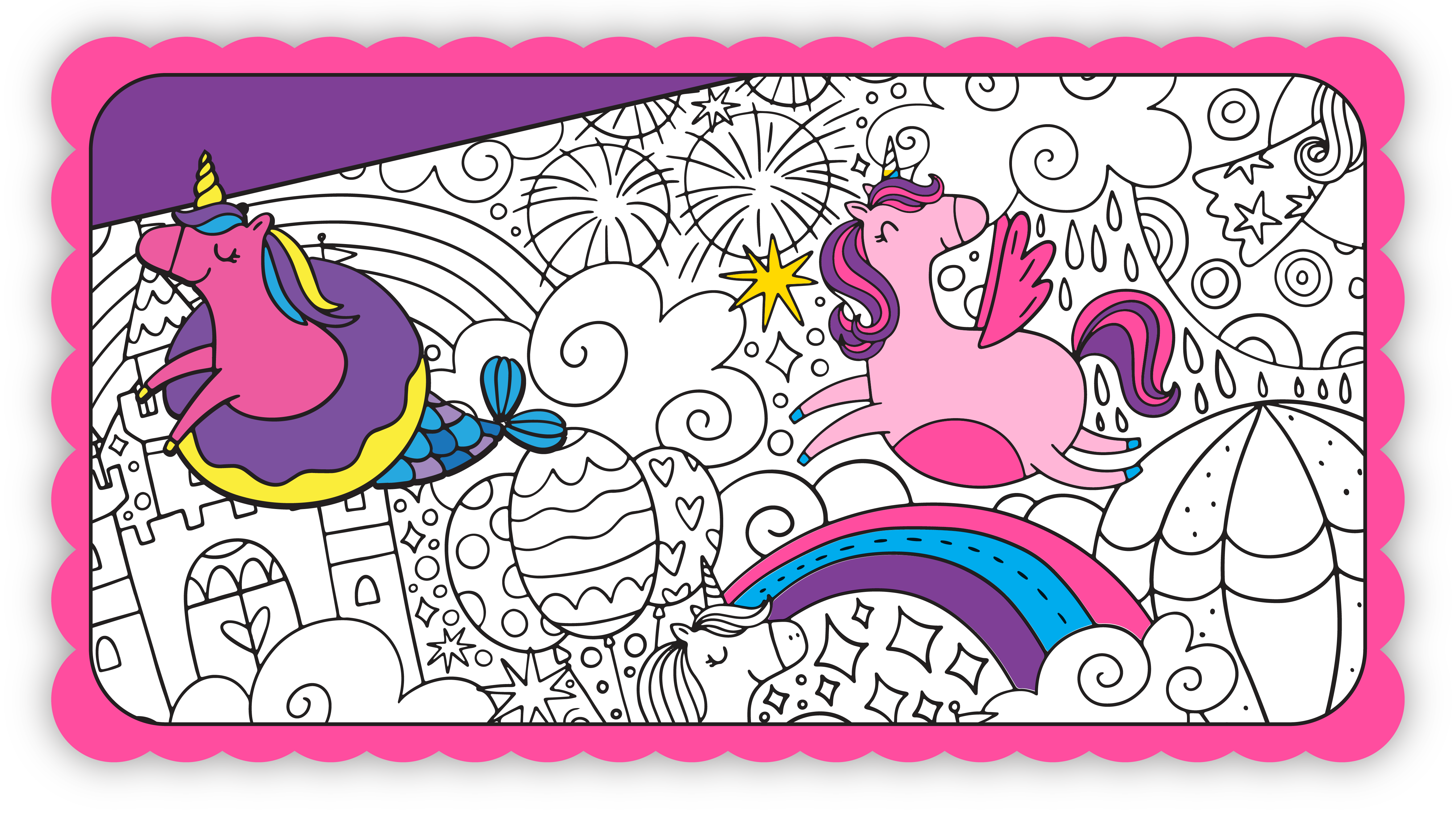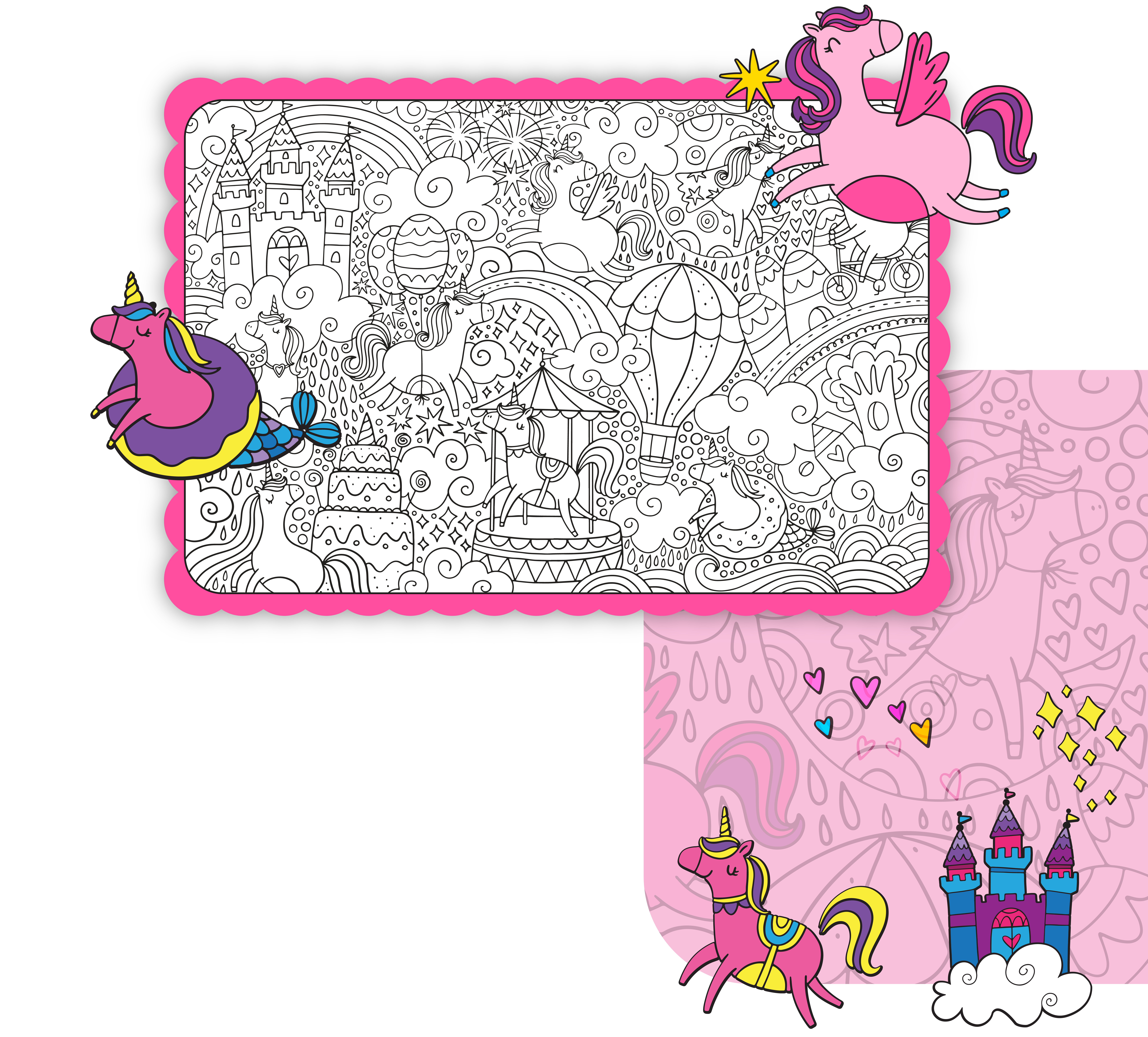 Our magical mat invites you to unleash your creativity and explore a world where unicorns prance beside magical castles, cakes soar high, merry-go rounds spin with joy, mermaids swim gracefully, and rainbows shimmer in the sky.