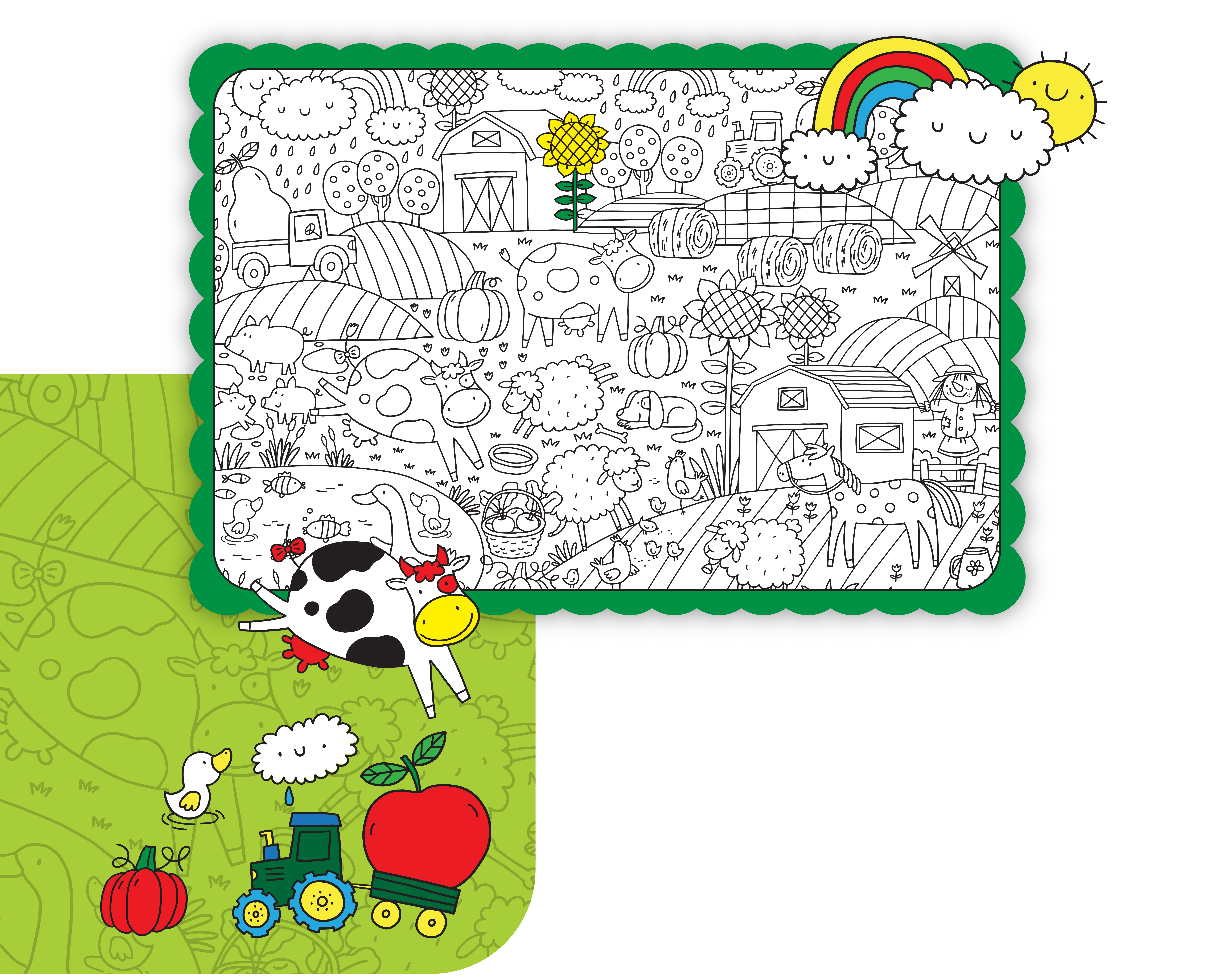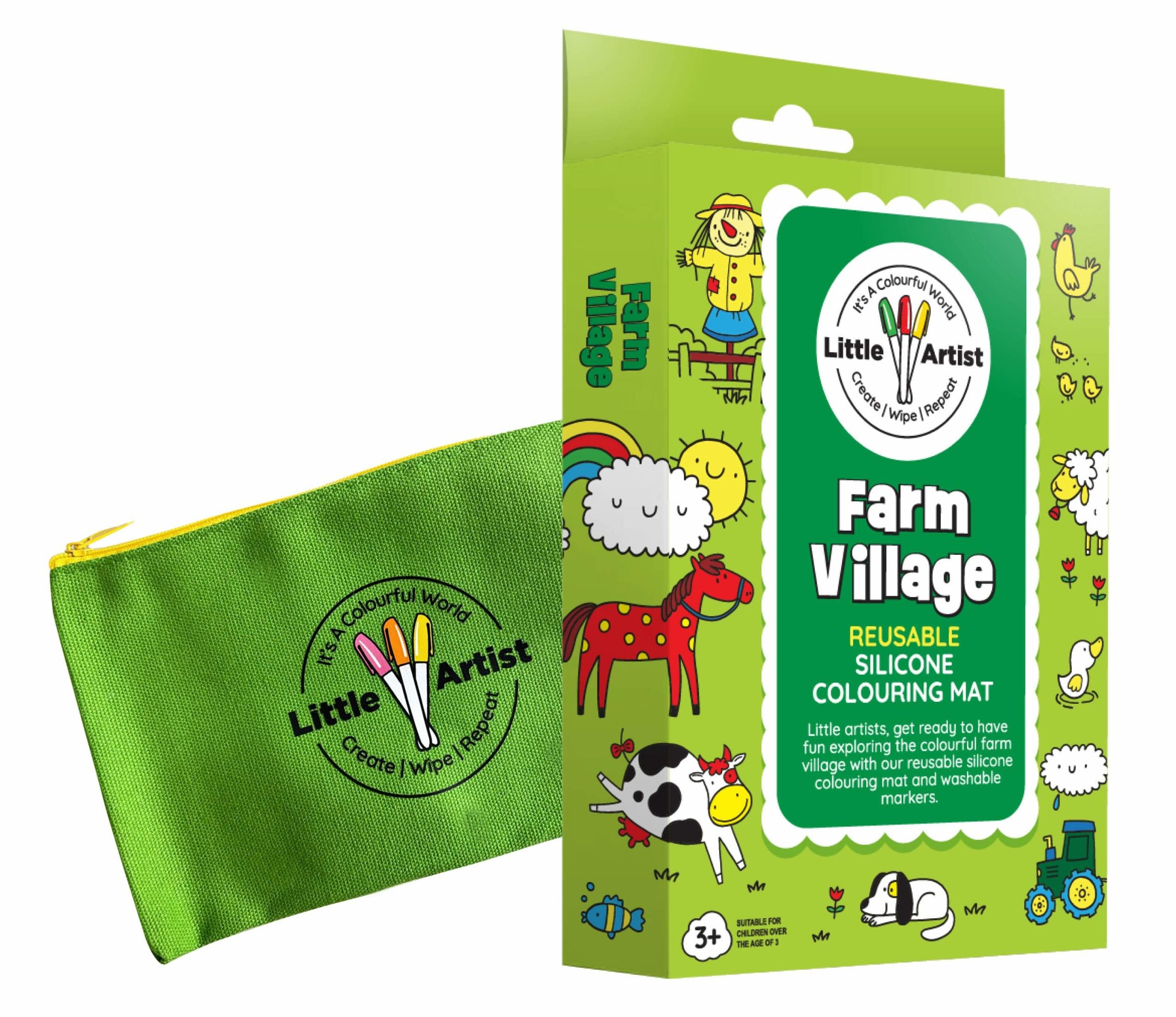 - 20 x 30cm reusable silicone colouring mat in our Farm Village design.